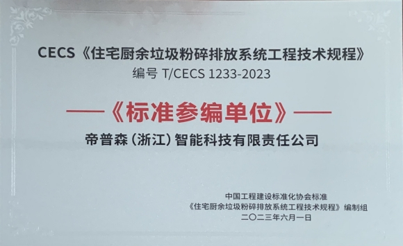 由中国工程建设标准化协会主导,中国建筑设计研究院有限公司、国家住宅与居住环境工程技术研究中心、帝普森(浙江)智能科技有限责任公司等单位联合编制的《住宅厨余垃圾粉碎排放系统工程技术规程》(T/CECS 1233-2023),已通过各项审核,自2023年6月1日起正式施行。这是帝普森团队继起草“浙江制造”《家用厨余垃圾处理器团体标准》后,再次参编重要的行业相关标准。