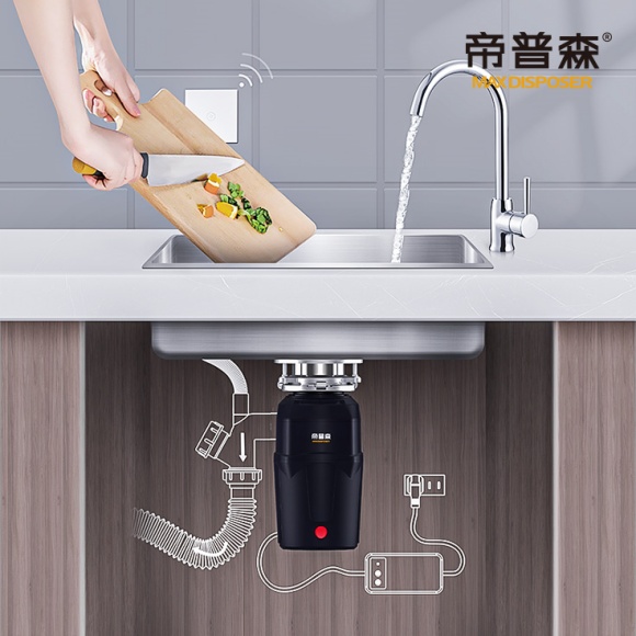 一般水槽下的空间较潮湿,不宜置物。垃圾处理器隐藏在水槽下橱柜中,能充分利用水槽下的空间,也不影响开放式厨房的整体美感。帝普森厨余垃圾处理器在设计方面简洁优雅,色彩百搭,适合各种风格的厨房选用。