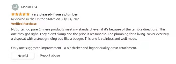 纯粹的中国产品通常不符合我的标准,中国产品经常方向(向左旋转、向右旋转)都搞不对。这个产品方向他们做对了。他们没有吝啬,价格也很合理。我做水管工为生。还从来没有买到过一个垃圾处理器像ISE的badger系列一样,是使用不锈钢做研磨盘的(steel grinding bed)。这个HA500是不锈钢的,做工精良。只有一个建议改进 - 更厚和更高质量的排水附件。