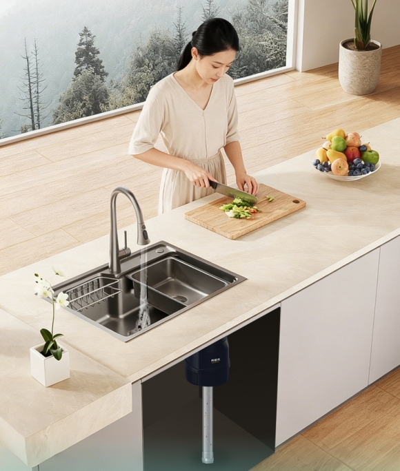 没装它之前,我家厨房最头疼的就是饭后收拾。扔掉的菜叶、削的果皮、吃完饭的菜底残渣,弄得水槽滤网里黏黏糊糊的,一天不倒垃圾,那个味儿就上来了,夏天尤其烦人。
