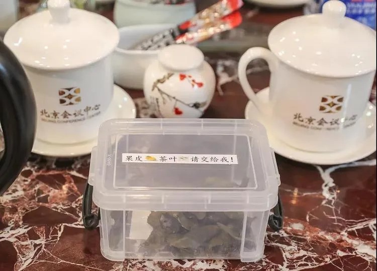 每个房间内配备《北京市生活垃圾分类指导手册》及“可回收物”和“其他垃圾”两个垃圾桶。还有一个透明盒子,收集厨余垃圾,例如果皮果核、茶叶咖啡残渣。